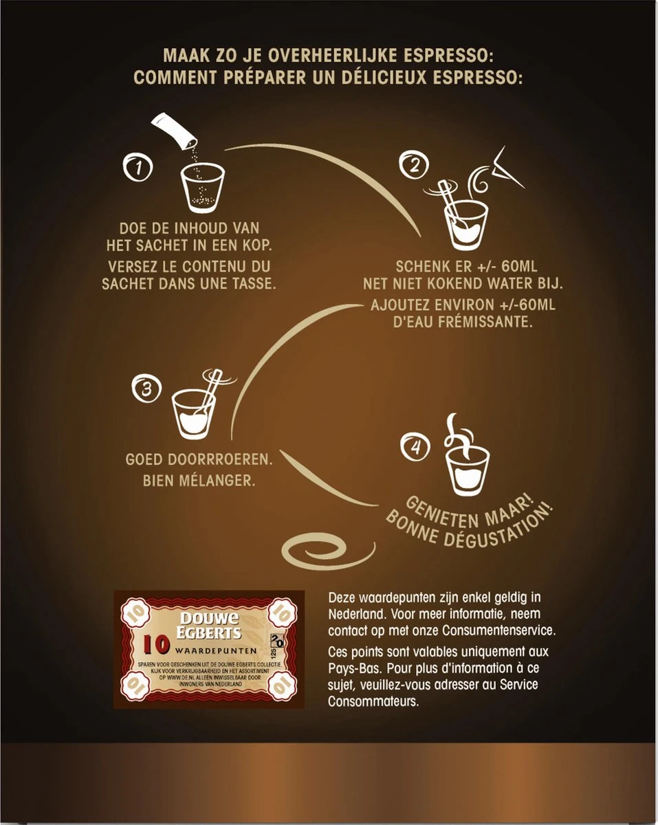 Douwe Egberts Espresso Sticks geven je net even die extra kick met een krachtige koffie in een handomdraai. De blend van donker gebrande Robusta bonen zorgt voor een volle smaak. Op ieder moment en overal door de handige zakjes om mee te nemen.
