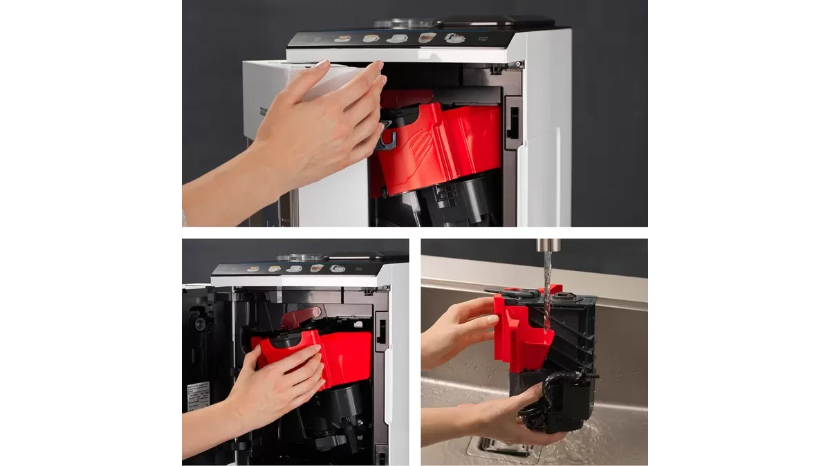 Om je koffiemachine in topconditie te houden is het belangrijk om deze goed te onderhouden. Gelukkig is dit bij de Siemens EQ.500 serie eenvoudig. Zo kan je bijvoorbeeld op het lcd-schermpje zien wanneer je je lekbak en koffiedikreservoir moet schoonmaken. Deze zitten beide achter de servicedeur samen met de zetgroep. Deze kan je er ook uithalen om grondig schoon te maken. Dit doe je best eenmaal per week zodat er geen ophoping kan ontstaan van olie- en vetresten en je koffiesmaak niet langzaam achteruit gaat. Het is ook belangrijk om op het einde van de dag het gebruikte melksysteem te reinigen met het automatisch reinigingsprogramma en met de Calc’nClean heb je één onderhoudsprogramma voor de reinigings- en ontkalkingscyclus. Wanneer je de BRITA waterfilter gebruikt hoef je maar 4 keer per jaar te ontkalken.