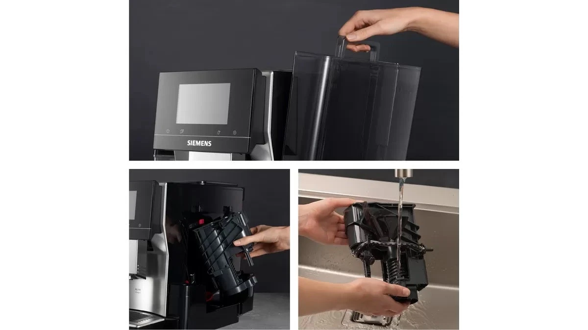 Om je koffiemachine in topconditie te houden en het een zo lang mogelijk leven te geven is het belangrijk dat je deze goed gaat onderhouden. Gelukkig is dit bij de Siemens EQ.700 serie ook erg gemakkelijk. Dankzij het handige kleuren touchscreen kan je heel erg gemakkelijk naar de instellingen gaan voor het onderhoud. Je machine zal je vertellen wanneer je bijvoorbeeld je lekbak en koffiedikreservoir moet schoonmaken en wanneer je een algemene reiniging moet doen van je zetgroep. Alles is ook heel gemakkelijk uit de machine te halen om te reinigen. Zo kan je de zetgroep er langs de zijkant van de machine gemakkelijk uithalen om grondig schoon te maken. Dit doe je best eenmaal per week onder lauw water zodat er geen ophoping kan ontstaan van olie- en vetresten en je koffiesmaak niet langzaam achteruit kan gaan. Het is ook belangrijk om zeker op het einde van de dag het gebruikte melksysteem te reinigen met het automatische reinigingsprogramma, zo kan er zeker niets zuur worden in het systeem of de melkslang. Met de Calc’nClean optie heb je één onderhoudsprogramma voor de reinigings- en ontkalkingscyclus. Wanneer je de BRITA-waterfilter gebruikt hoef je zelfs maar 4 keer per jaar te ontkalken. Zo blijft je machine schoon en verleng je de levensduur ervan!